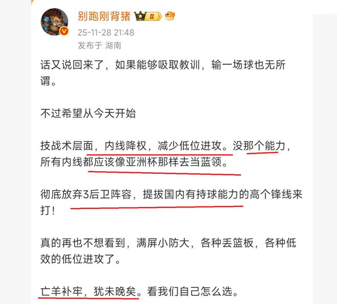 “别跑刚背猪”表示,在比赛中,周琦很多低位进攻,这是非常传统的打法,然而,周琦的能力摆在这里,他并没有姚明这样的内线杀伤力,结果,大家也是看到了,周琦内线单打的效果很糟糕,就算是获得了罚球,周琦罚球命中率也只有五成,十分尴尬。所以,“别跑刚背猪”认为应该要减少低位进攻,中锋要去当篮领,别当大哥。