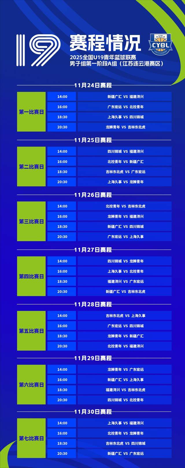 广东U19男篮的赛程已经出炉,11月24日下午16点,对阵北控,11月25日晚上18:30,对阵吉林。11月26日晚上20:30,对阵上海。11月27日晚上18:30,对阵福建。11月28日下午16点,对阵四川。11月29日下午14点,对阵广州。11月30日晚上20:30,对阵新疆。